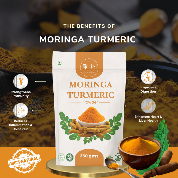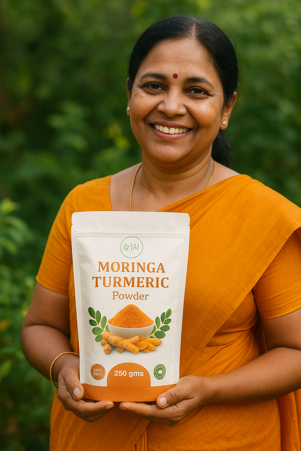 Moringa Turmeric Powder is a powerful herbal blend made by combining nutrient-rich Moringa leaves with anti-inflammatory Turmeric root. This superfood mix delivers a perfect balance of vitamins, minerals, antioxidants, and curcumin, supporting immunity, digestion, joint health, and natural energy.